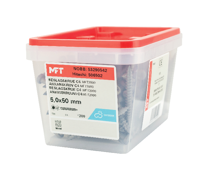 MFT Beslagskrue har MFT 2000 C4 testet oveflatebehandling er laget av herdet karbonstål SAE 10B21 og oppfyller CE kravet ihht. EN 14592. Overflatebehandlingen er testet 2000 timer i saltkammertest. Korrosjonsklasse C4 med Testrapport 39-17692/JP. Kuleformet hode med konisk underside for optimal passform i bygg-/ vinkelbeslag, stolpe-/ bjelkesko mm. Helgjenget med fibercut for å redusere faren for sprekkdannelse ved innskruing. TX20 Bitsfeste. Tips! Ved montering skal momentet på drillen kobles inn slik at skruen ikke overdras. Slagtrekker anbefales ikke.