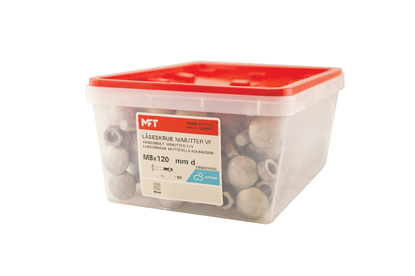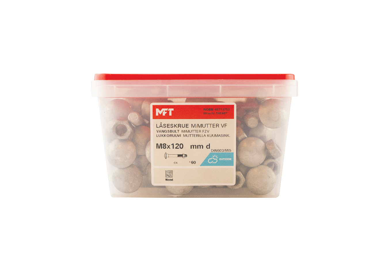 MFT Låseskrue med mutter brukes for sammenskruing av trestendere, platematerialer mot underlag av tre eller stål. Under det kuppelformede hodet er det en firkant som fungerer som en låsing i det mykere materialet da sammenskruing skjer. For innendørs og utendørs bruk.