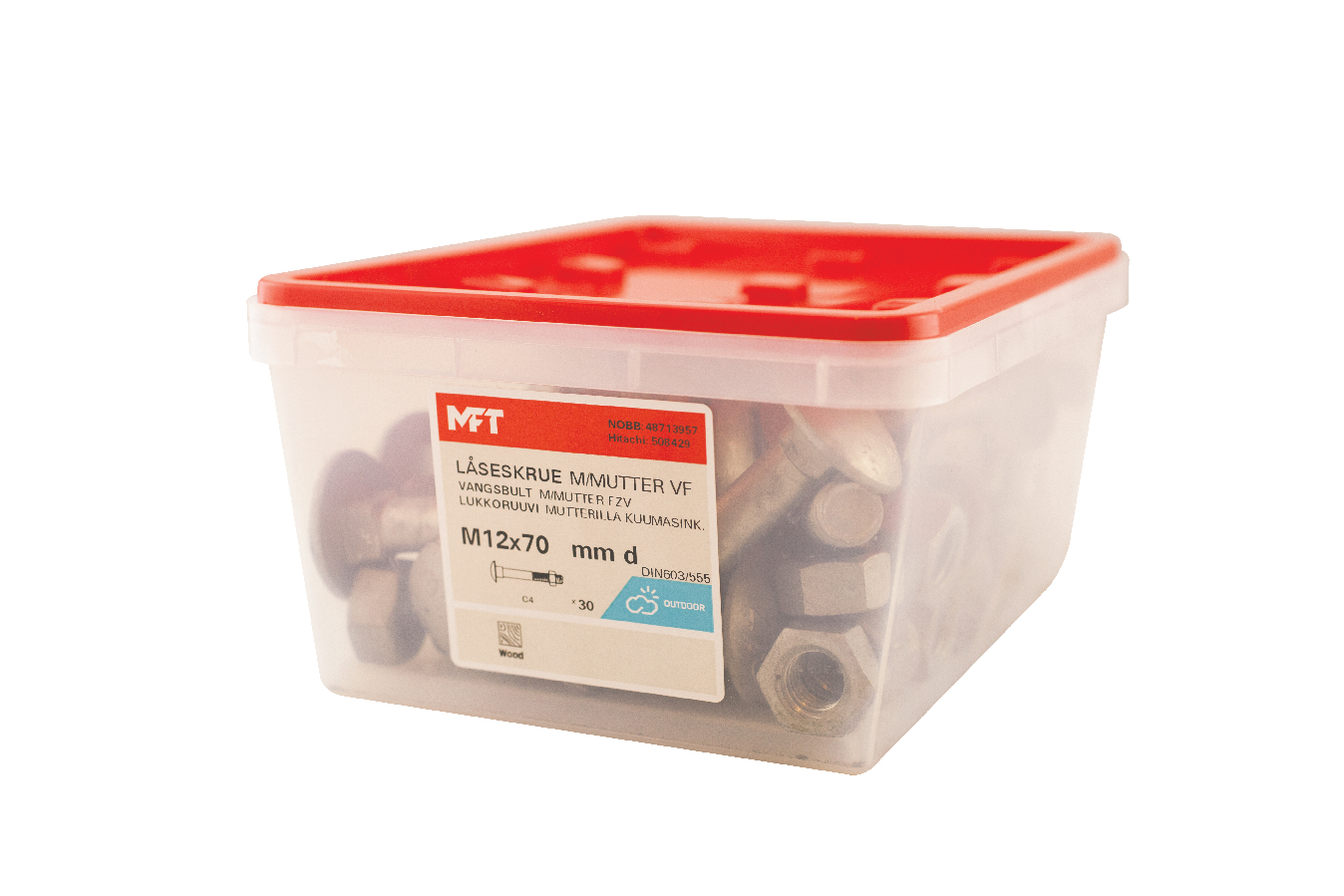 MFT Låseskrue med mutter, låseskruen er produsert i henhold til DIN603 og mutter i henhold til DIN934 standard i herdet karbonstål, kvalitet 4.8. Låseskrue og mutter har en varmforsinket overflatebehandling. Korrosjonsklasse C3. Delgjenget.