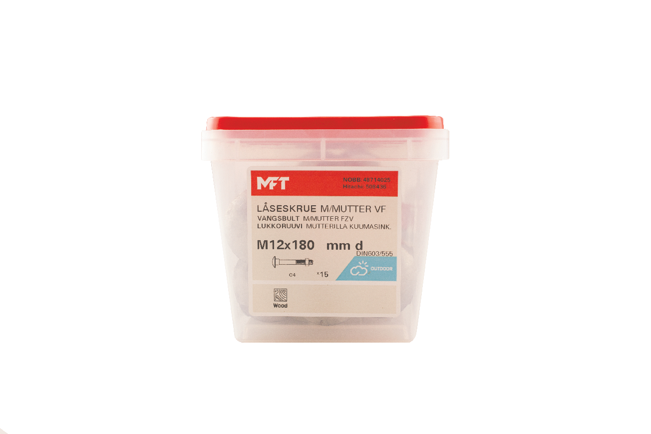 MFT Låseskrue med mutter, låseskruen er produsert i henhold til DIN603 og mutter i henhold til DIN934 standard i herdet karbonstål, kvalitet 4.8. Låseskrue og mutter har en varmforsinket overflatebehandling. Korrosjonsklasse C3. Delgjenget.
