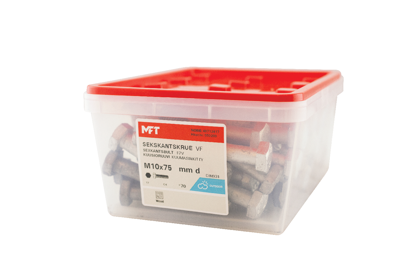 MFT Sekskantskrue M6S brukes sammen med mutter ved sammenskruing av detaljer. For innendørs og utendørs bruk.