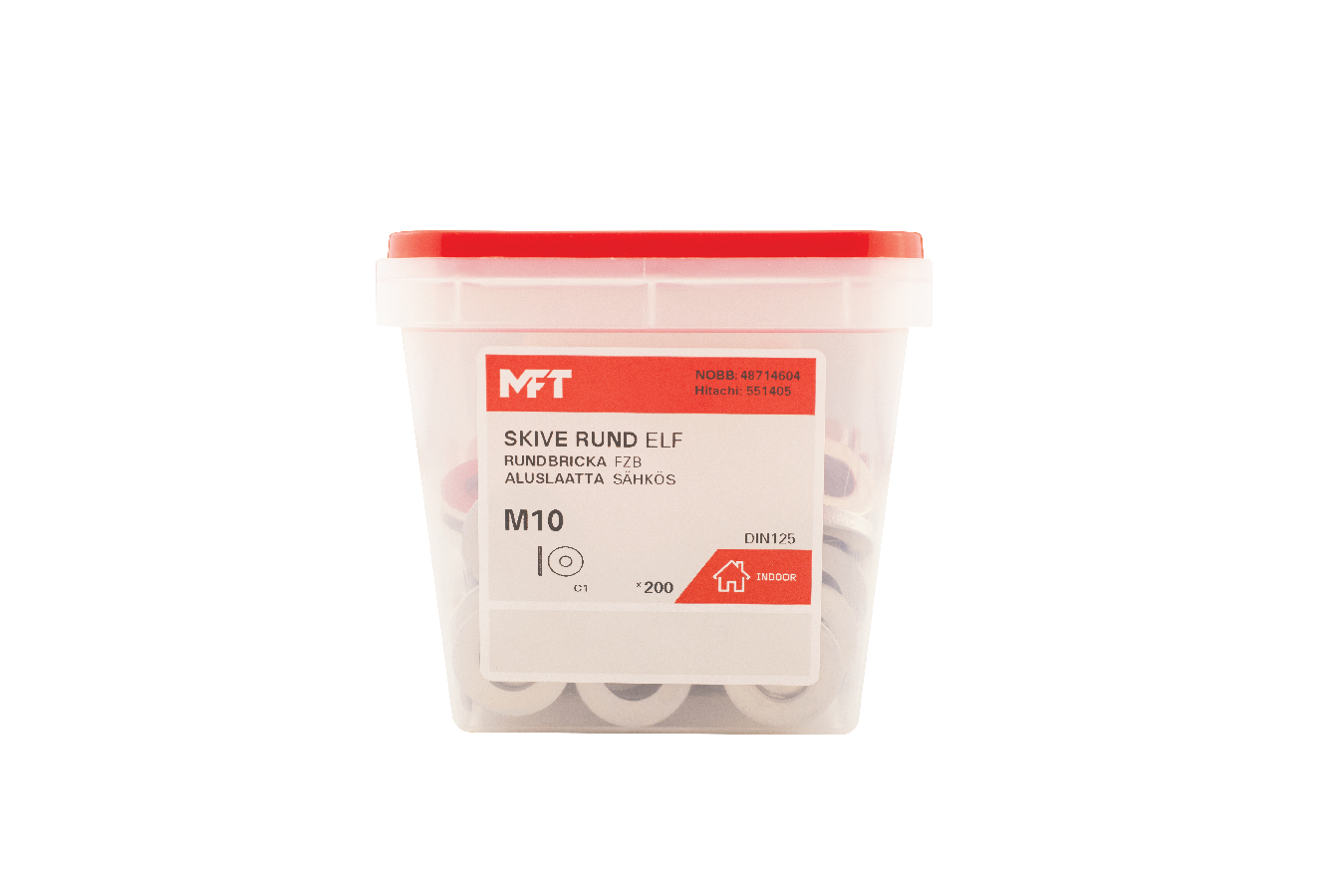 MFT Skive rund er produsert i henhold til DIN125 standard i herdet karbonstål. Skiven har en elektrolytisk overflatebehandling. Korrosjonsklasse C1.