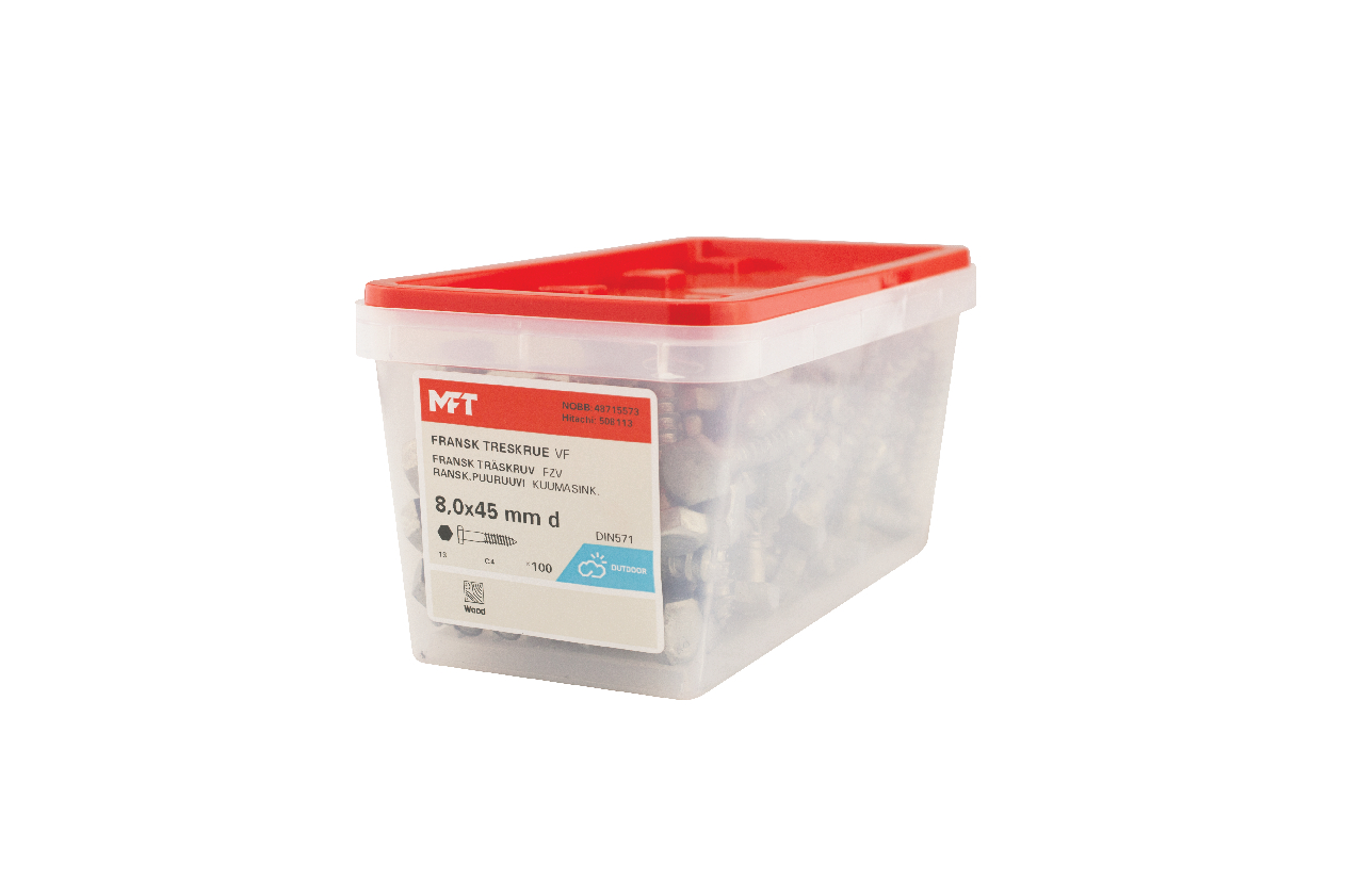 MFT Fransk treskrue er beregnet for montasje i tre innendørs og utendørs. Forborring kan anbefales med tilpasset bordiameter, bruk gjerne varmforsinket firkantskive, DIN436, som gir et forbedret resultat. Anbefalt innskruingshastighet: 400-1200/min.