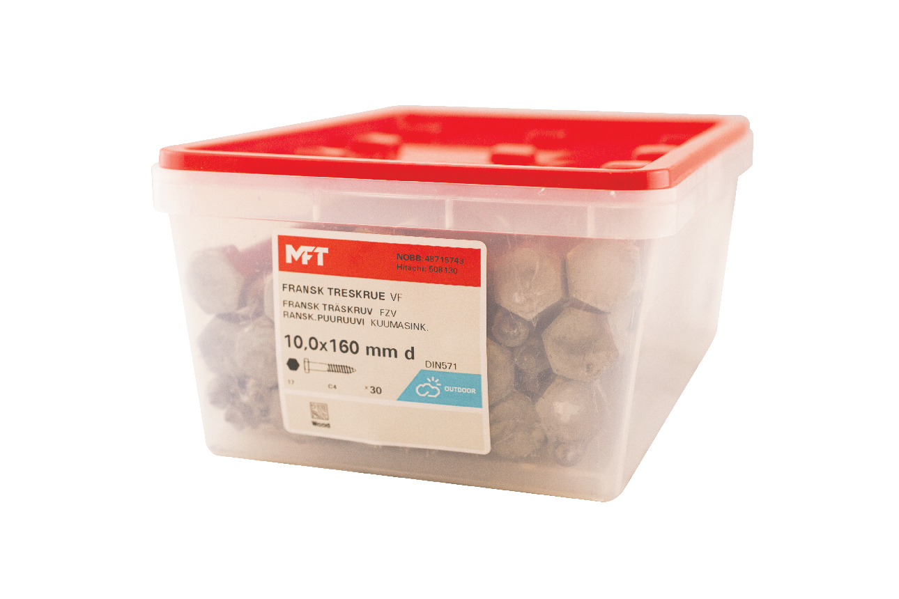 MFT Fransk treskrue er beregnet for montasje i tre innendørs og utendørs. Forborring kan anbefales med tilpasset bordiameter, bruk gjerne varmforsinket firkantskive, DIN436, som gir et forbedret resultat. Anbefalt innskruingshastighet: 400-1200/min.