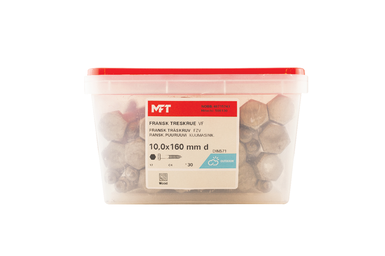 MFT Fransk treskrue med varmforsinket overflatebehandling laget i karbonstål, kvalitet 4.6. Korrosjonsklasse C3. Skruen er produsert ihht. DIN 571. Sekskantshode og delgjenget.